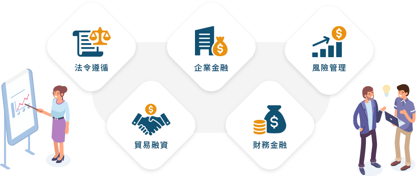 規劃法令遵循、貿易融資、企業金融、財務金融、風險管理等五大領域課程,透過觀念講授、個案研討及模擬演練等多元化教學方式。